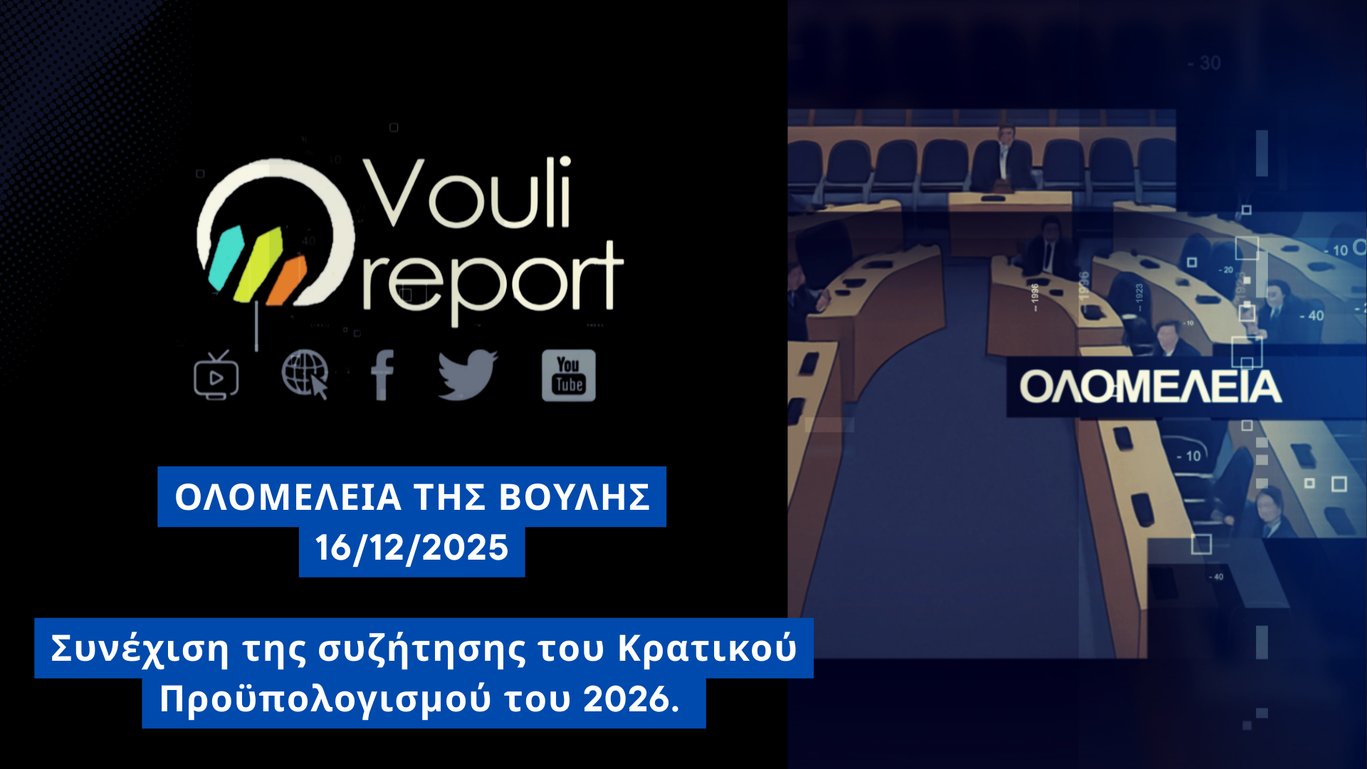 📺 Το Vouli Report μεταδίδει σε ζωντανή αναμετάδοση τη συνεδρία της Ολομέλειας της Βουλής των Αντιπροσώπων, με αντικείμενο τη νομοθετική εργασία: