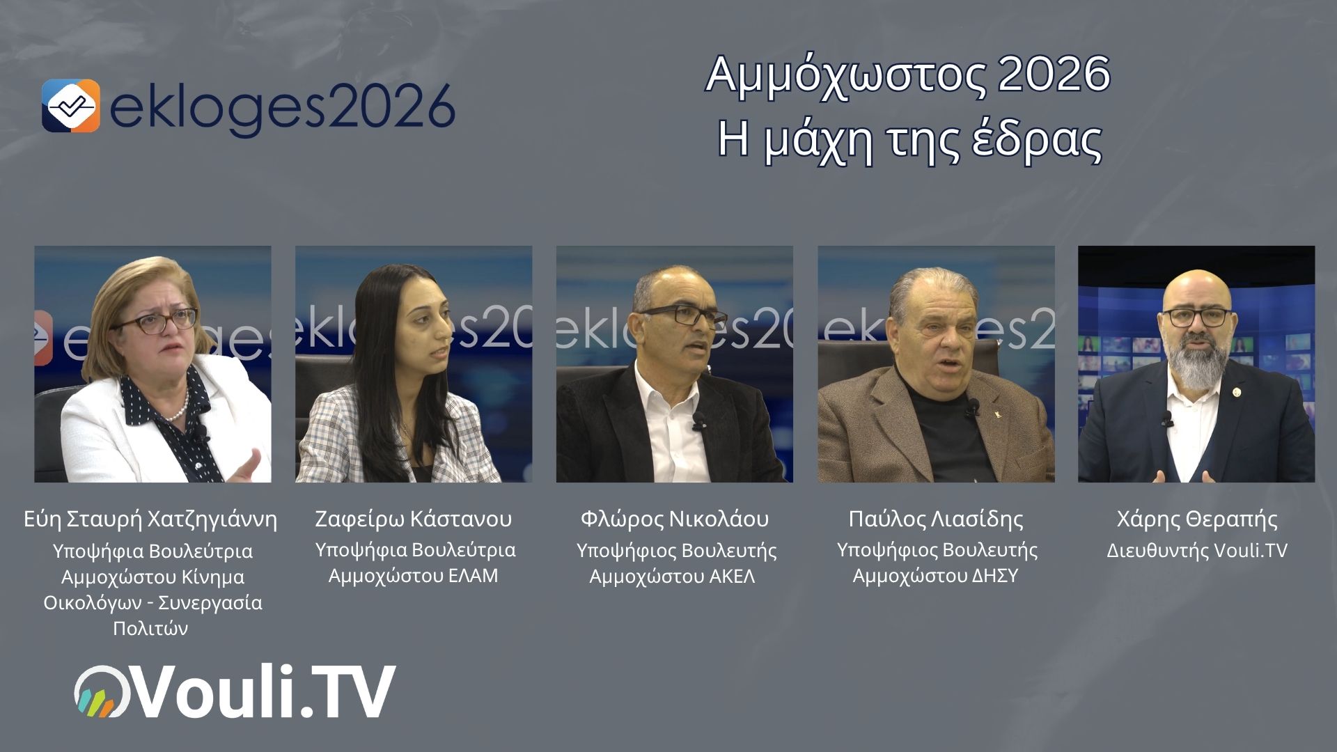 Στην εκπομπή Ekloges 2026, με παρουσιαστή τον Χάρη Θεράπη, ξεδιπλώθηκε η μάχη για την έδρα στην επαρχία Αμμοχώστου, ενόψει των εκλογών, με τους υποψηφίους να τοποθετούνται για τα προβλήματα, τις προκλήσεις και τις λύσεις που προτείνουν για την περιοχή.