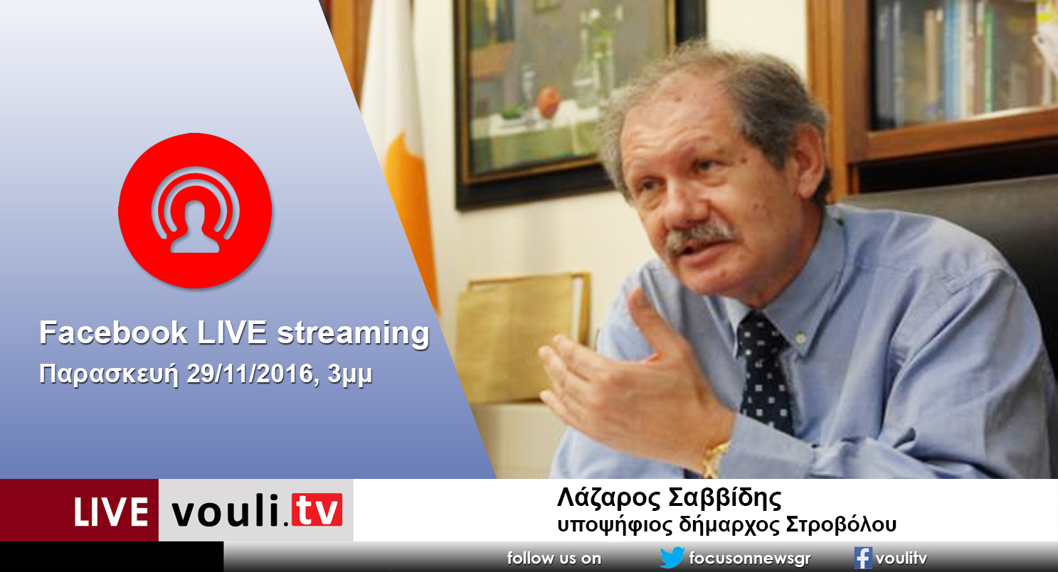 Παρακολουθείστε σήμερα (29/11) στις 3μμ σε Facebook LIVE streaming, την μεγάλη συνέντευξη του υποψήφιου δημάρχου Στροβόλου κου Λάζαρου Σαββίδη Η συνέντευξη θα είναι διαθέσιμη σε video...