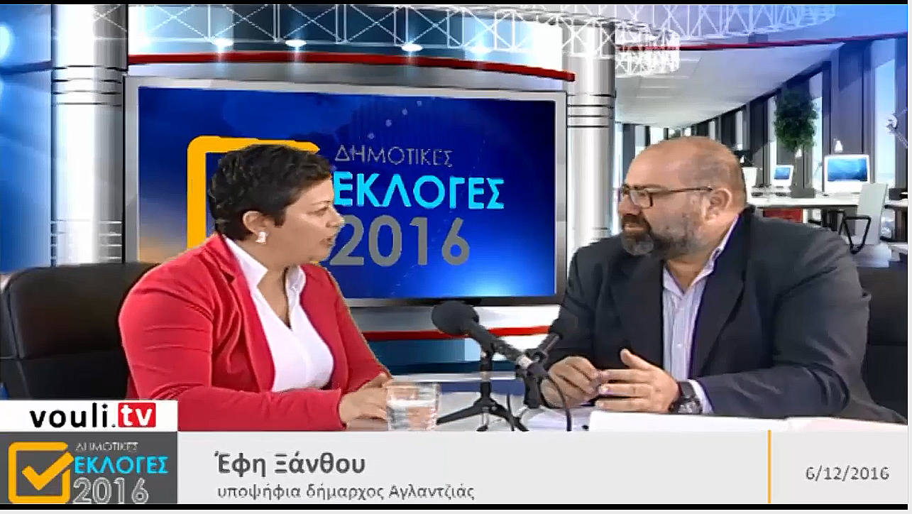 Φιλοξενούμενη στο στούντιο του Vouli.TV η υποψήφια δήμαρχος Αγλαντζιάς Έφη Ξάνθου, σε μία συνέντευξη εφ’ όλης της ύλης.