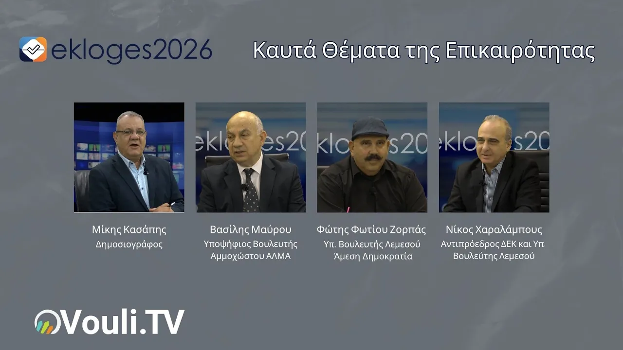 Σε ένα πολυθεματικό διάλογο που άγγιξε τα πιο κρίσιμα ζητήματα της επικαιρότητας, η εκπομπή Ekloges 2026 με παρουσιαστή τον Μίκη Κασάπη επικεντρώθηκε στις βασικές ανησυχίες της κοινωνίας, στη διαχείριση κρίσεων όπως ο αφθώδης πυρετός, στις αδυναμίες του κρατικού μηχανισμού, καθώς και στο Κυπριακό, αναδεικνύοντας τις διαφορετικές προσεγγίσεις των πολιτικών δυνάμεων.