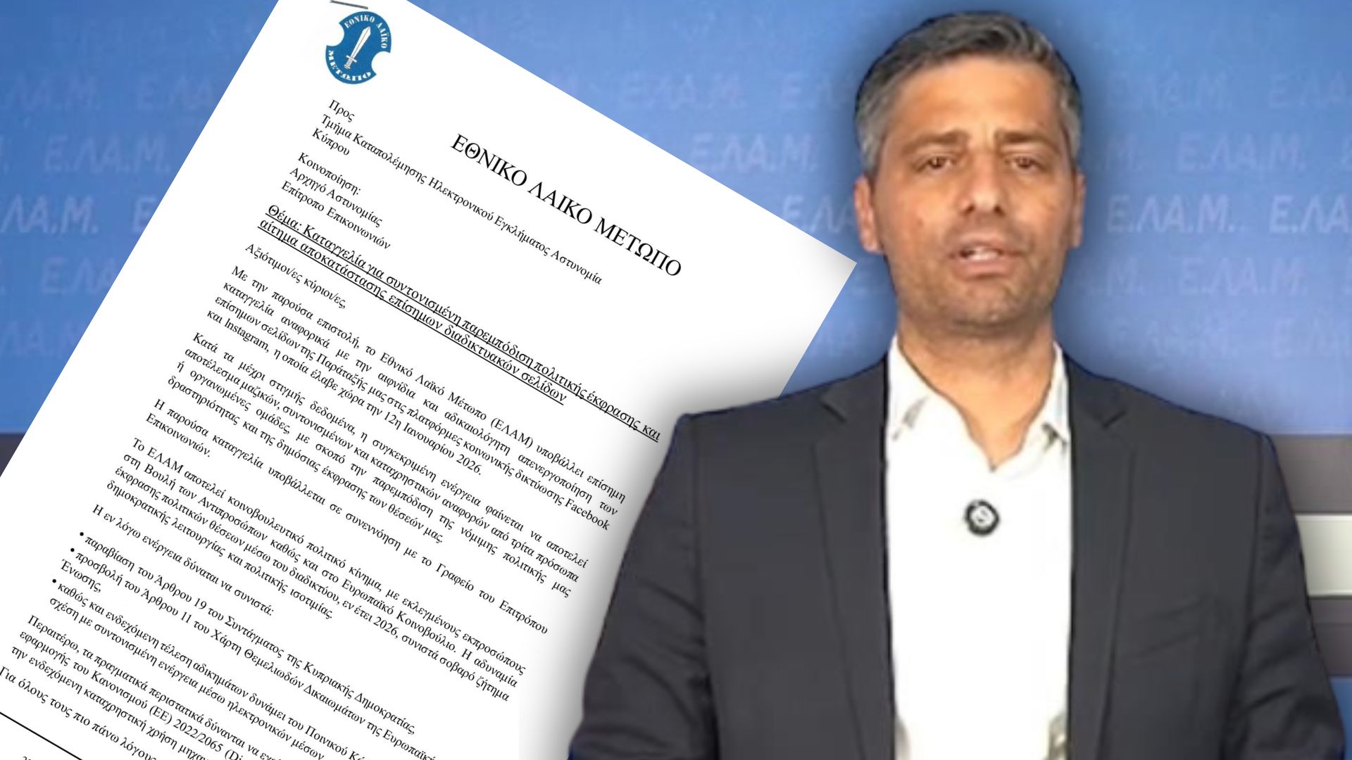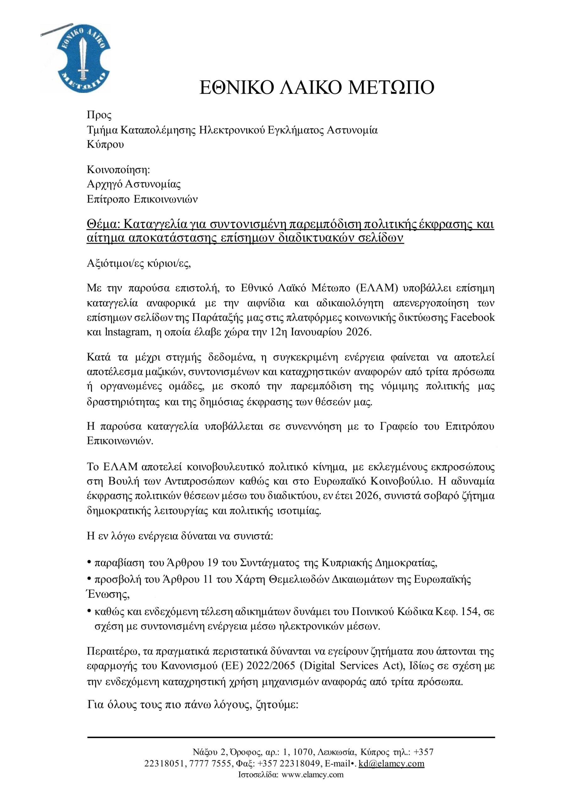 Σε ανακοίνωση του το ΕΛΑΜ αναφέρει πως, «υποβάλαμε επίσημη καταγγελία προς το Τμήμα Ανιχνεύσεως Εγκλημάτων, η οποία κοινοποιήθηκε στον Αρχηγό Αστυνομίας και στον Επίτροπο Επικοινωνιών, σχετικά με την αιφνίδια και αδικαιολόγητη απενεργοποίηση των επίσημων σελίδων της Παράταξής μας στις πλατφόρμες Facebook και Instagram, η οποία έλαβε χώρα στις 12 Ιανουαρίου 2026».