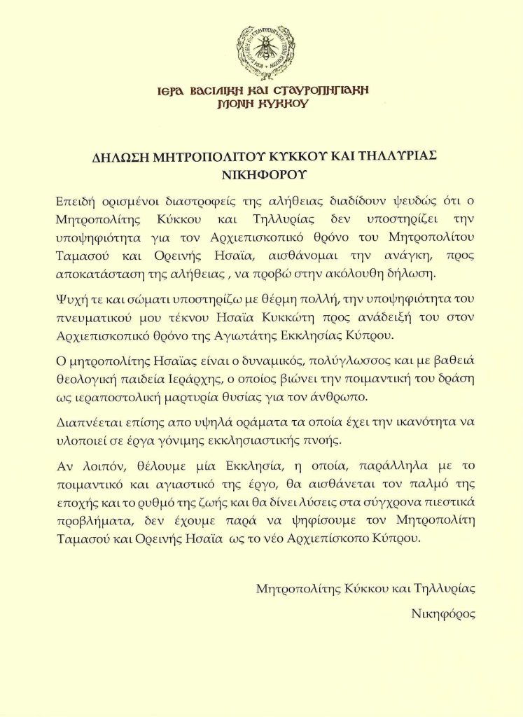 «Επειδή ορισμένοι διαστροφείς της αλήθειας διαδίδουν ψευδώς ότι ο Μητροπολίτης Κύκκου και Τηλλυρίας δεν υποστηρίζει την υποψηφιότητα για τον Αρχιεπισκοπικό θρόνο του Μητροπολίτου Ταμασού και Ορεινής Ησαϊα, αισθάνομαι την ανάγκη, προς αποκατάσταση της αλήθειας , να προβώ στην ακόλουθη δήλωση.