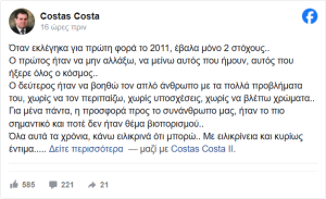 Καταλήγοντας, εξέφρασε τις ευχαριστίες του: «Ευχαριστώ ειλικρινά όλο τον κόσμο από κάθε γωνιά της Κύπρου για τα καλά τους λόγια και τη στήριξη. Η μεγάλη αγάπη του κόσμου ήταν πάντοτε η δύναμη και το κουράγιο μου για να συνεχίζω».