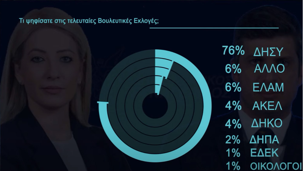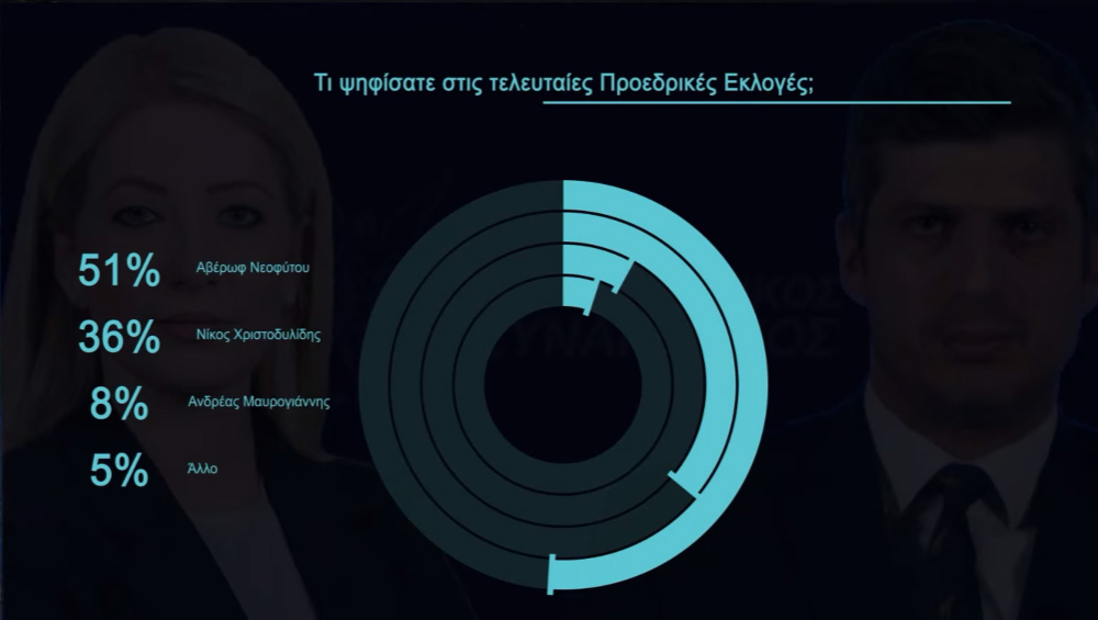 Στη δημοσκόπηση ψήφισαν 2225 άτομα, με ποσοστό 76% (1684 άτομα) να ψήφισαν ΔΗΣΥ στις τελευταίες Βουλευτικές εκλογές και ποσοστό 51% (1132 άτομα) να έχουν ψηφίσει Αβέρωφ Νεοφύτου στις τελευταίες προεδρικές εκλογές, ενώ ποσοστό 36% (799 άτομα) ψήφισαν Νίκο Χριστοδουλίδη.