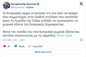 Οι Κυπριακές αρχές εντόπισαν ότι ένα από τα σκάφη που συμμετείχαν στον διεθνή στολίσκο, ο οποίος κατευθυνόταν προς τη Λωρίδα της Γάζας, επέλεξε να εισέλθει στα χωρικά ύδατα της Κυπριακής Δημοκρατίας.