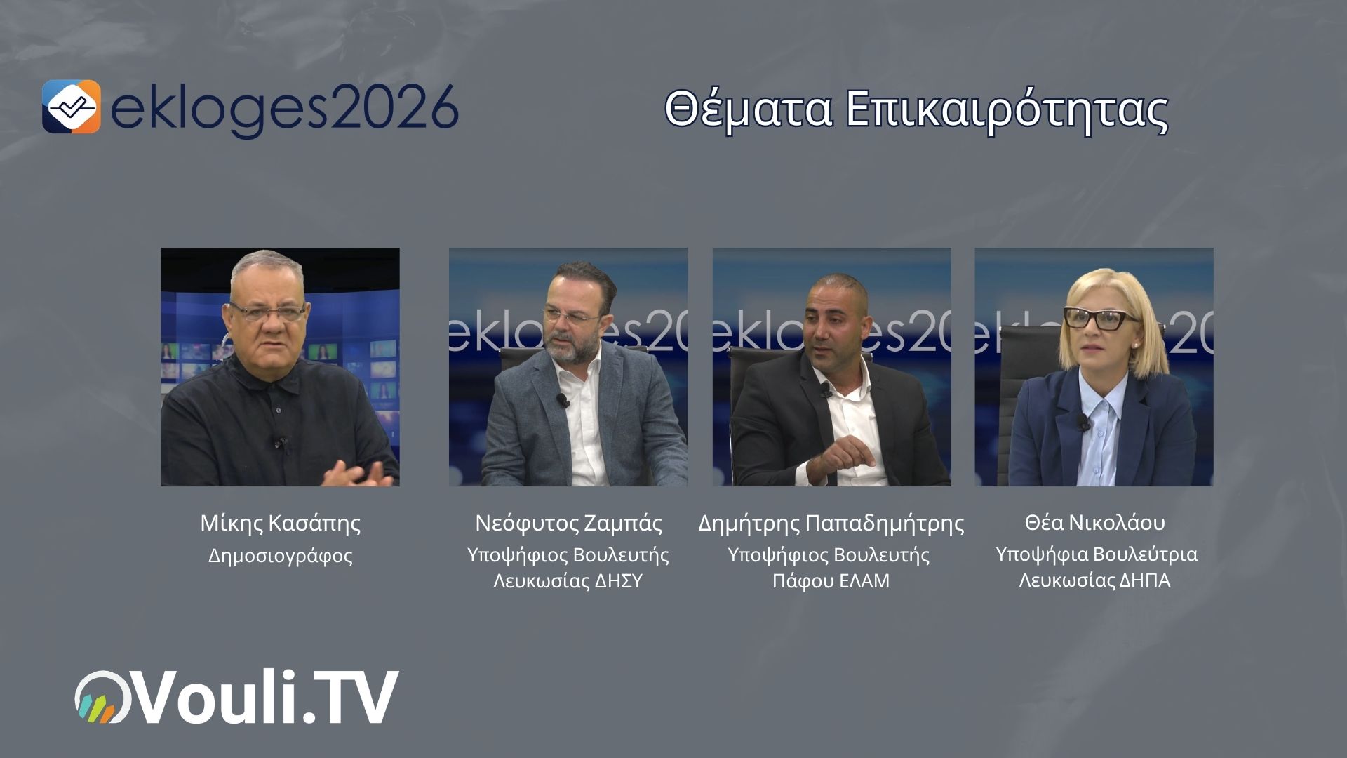 Οι εξελίξεις της επικαιρότητας και τα ζητήματα που απασχολούν έντονα την κυπριακή κοινωνία τέθηκαν στο επίκεντρο της εκπομπής «Εκλογές 2026», με παρουσιαστή τον Μίκη Κασάπη, ο οποίος συντόνισε μια δυναμική πολιτική συζήτηση ενόψει των επερχόμενων βουλευτικών εκλογών.