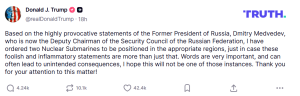 Επισήμως, η ανάρτηση του Τραμπ εμφανίζεται ως απάντηση στον Ντμίτρι Μεντβέντεφ, ο οποίος έχει μετατραπεί σε έναν ιδιαίτερα προκλητικό μεταπροεδρικό σχολιαστή, κυρίως μέσω διαδικτύου, στο εσωτερικό της Ρωσίας.